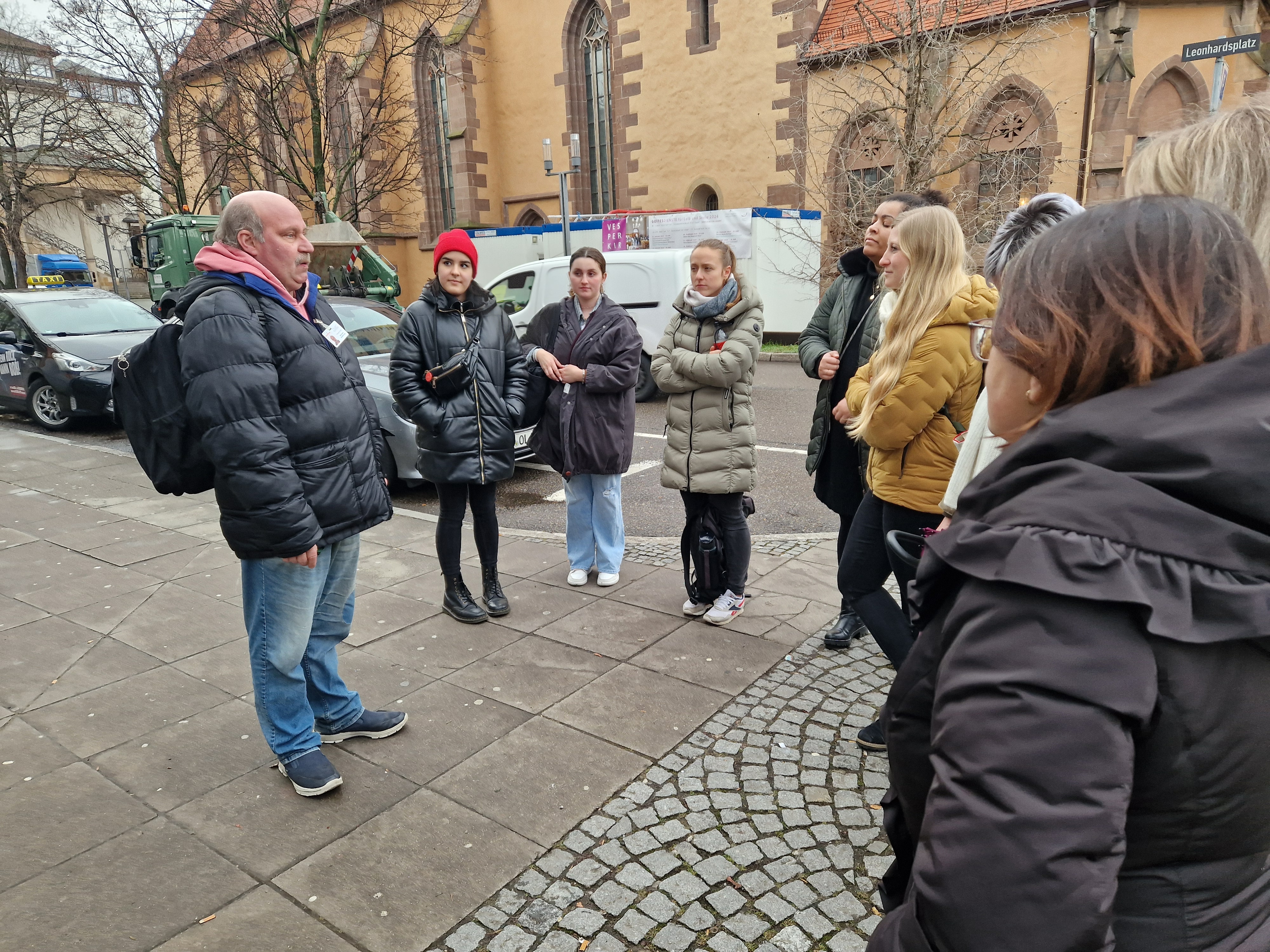 Nach einer persönlichen Begrüßung durch die Vorstände Volkmar Körner und Christian Ricken öffneten alle Abteilungen der Geschäftszentrale ihre Türen und stellten ihre Arbeitsbereiche vor. Katja Nowotny und Christoph Diel vom Gesamtpersonalrat waren ebenfalls vor Ort und sprachen über ihre Arbeit. Am Nachmittag ging es zu einer alternativen Stadtführung, organisiert vom Stuttgarter Verein Trott-war. Das Besondere daran: Statt zu klassischen Sehenswürdigkeiten, ging es zu sozialen Brennpunkten und Hilfseinrichtungen. Zu den Zwischenstopps gehörte zum Beispiel das Stuttgarter Drogencafé „High Noon“ und die Leonhardskirche – eine sogenannte Vesperkirche. Von Januar bis März erhalten Menschen dort täglich von 9 bis 15 Uhr Essen, medizinische Versorgung und haben die Möglichkeit, sich die Haare zu schneiden lassen. Der Stadtführer und langjährige Trott-war-Verkäufer Thomas Schuler gewährte im Rahmen der Führung offene und ehrliche Einblicke in seine Vergangenheit und die Herausforderungen, mit denen sich sozial benachteiligte Menschen konfrontiert sehen.